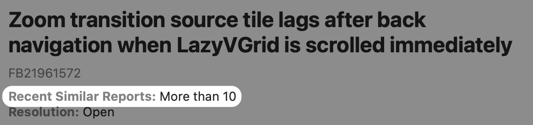 When navigating from a tile in a scrolling LazyVGrid to a child view using .navigationTransition(.zoom) and then returning, the source tile can lag behind the rest of the grid if scrolling starts immediately after returning.
