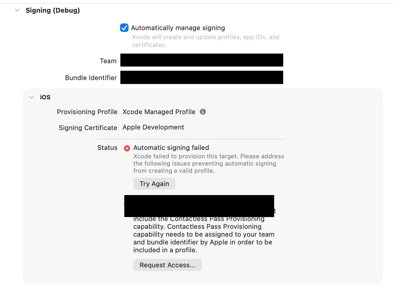 I am using Xcode 26.4 macOS 26.4. We have got the Contactless Pass Entitlements from Apple. But when i am trying to build my application it is throwing error in Debug Schema but the same is working for Release Schema