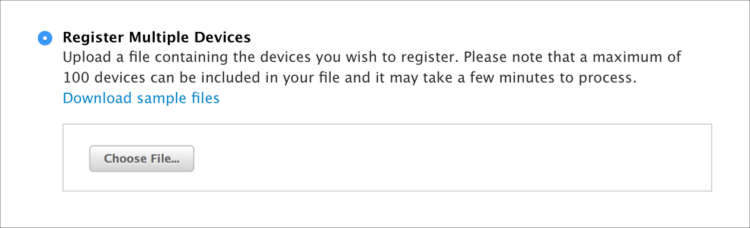 If you have many test devices, you can create a file containing the device names, device IDs, and platform, and upload the entire file to your developer account. Your developer account supports these two file formats: a property list file with a .deviceids file extension and a plain text file. The file format you choose depends on whether you have access to the devices you want to register.