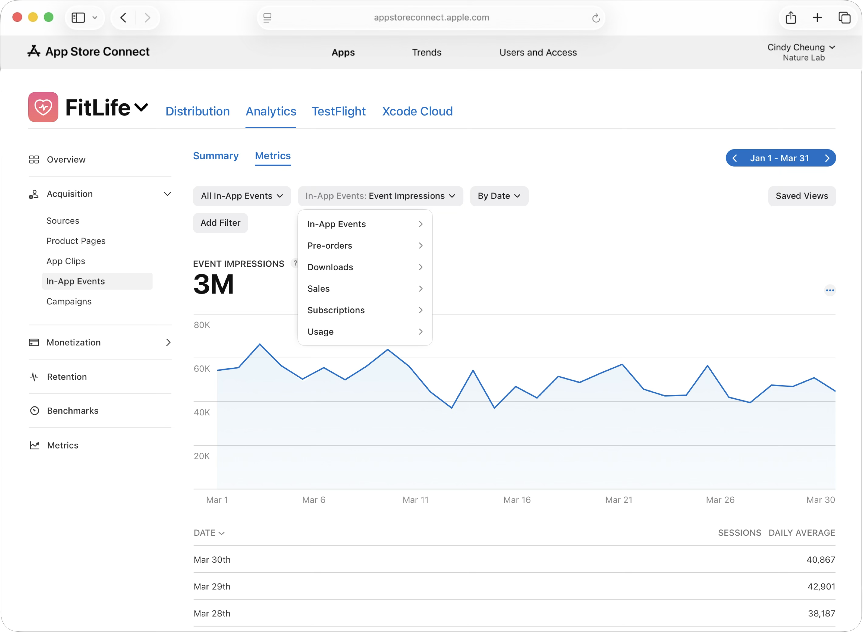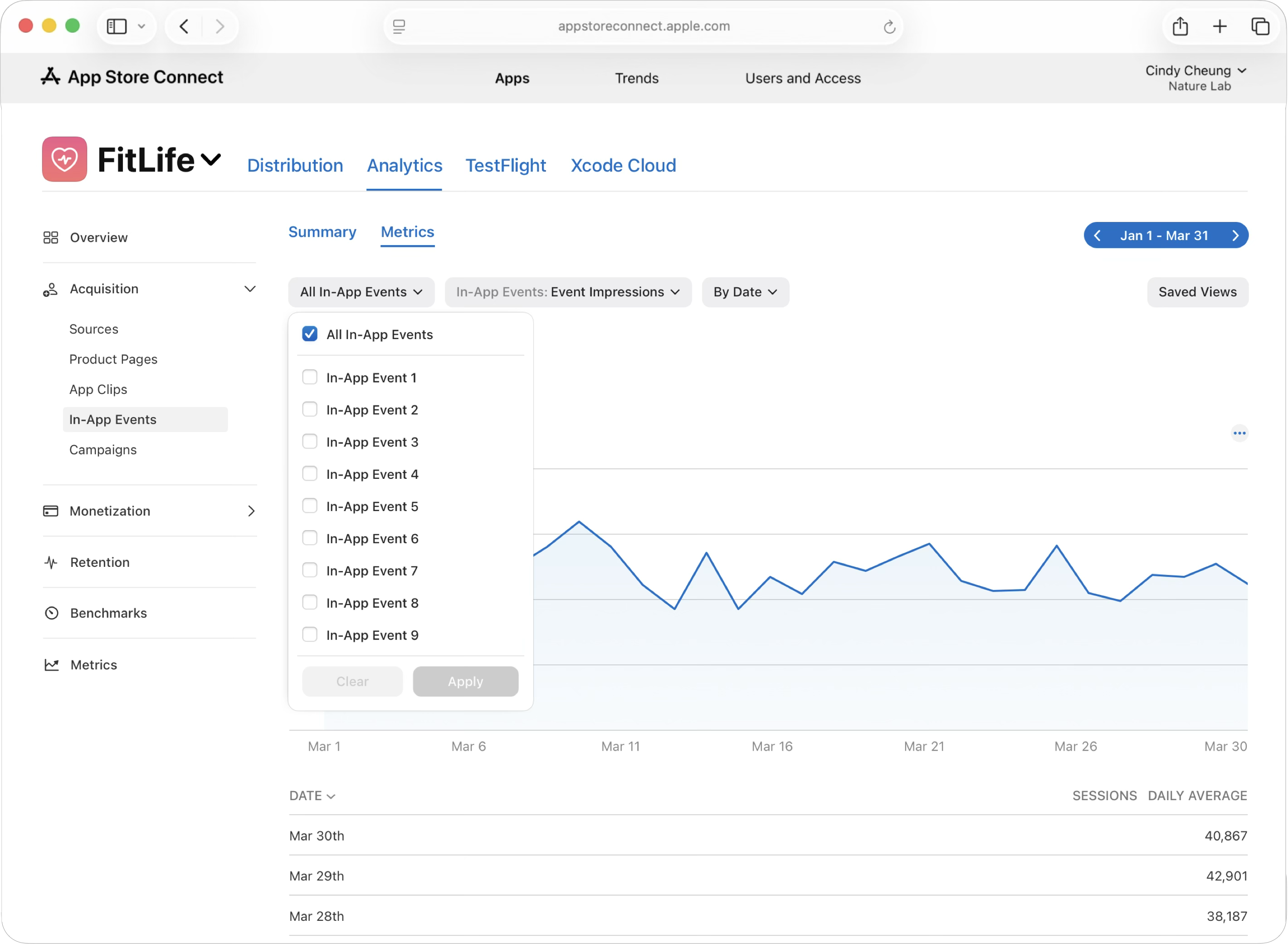 The metrics below are provided to help you analyze your In-App Event activity on the App Store. You can also filter Download, Usage, and Sales metrics by specific In-App Events to learn what happens after a user downloads or redownloads your app from an In-App Event card on the App Store.