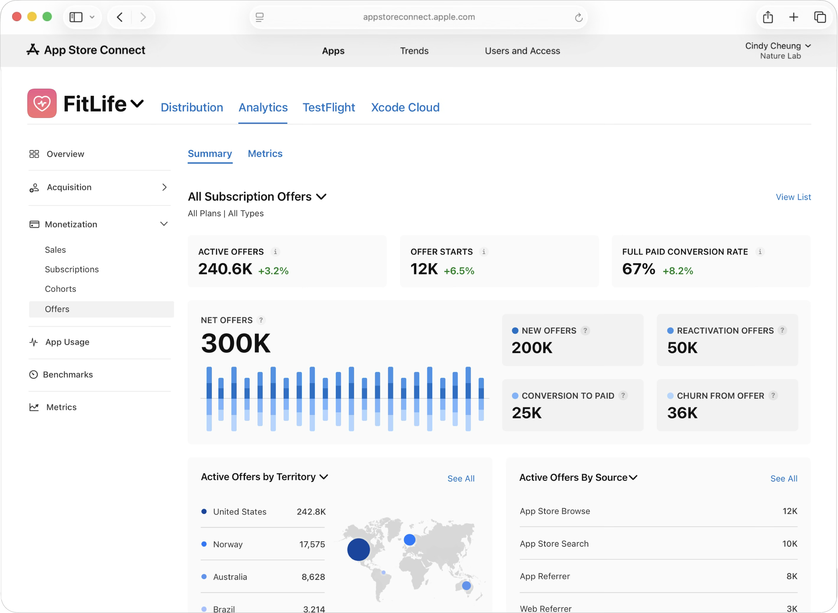 The Offers dashboard provides a comprehensive overview of your subscription offers' performance. It displays key metrics such as the volume of new and reactivated offers, the rate at which offers convert to paid subscriptions, and the churn rate from offers. Additionally, the dashboard breaks down active offer performance by geographic territory and by the acquisition source.
