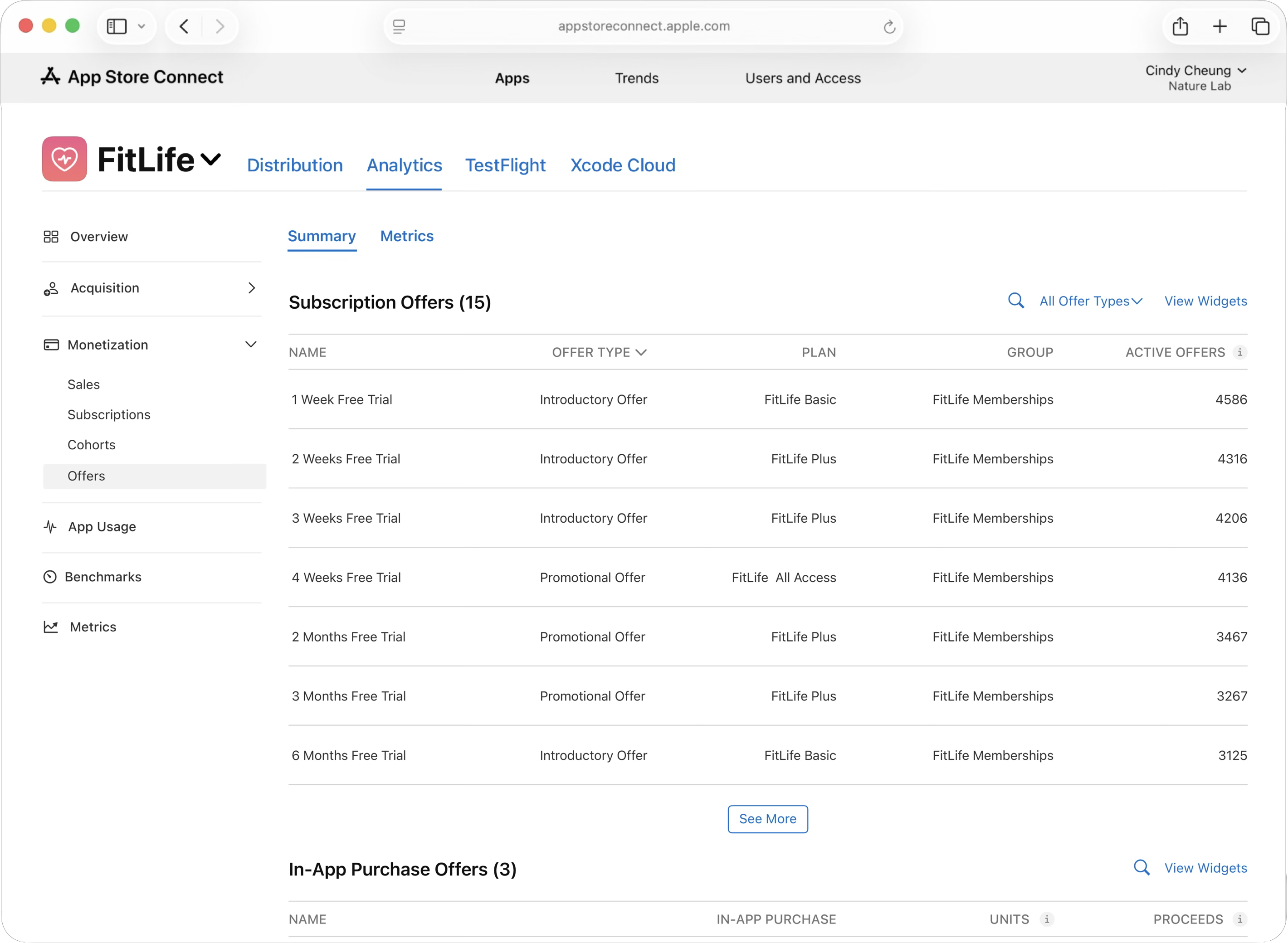Offers enable you to grow, retain, and re-acquire customers by giving them a free or discounted price on your In-App Purchases. Use app Analytics to track the performance of your subscription offers (including introductory, offer codes, promotional, and win-back offers) to understand how effectively these discounts are helping to grow, retain, and re-acquire customers.
