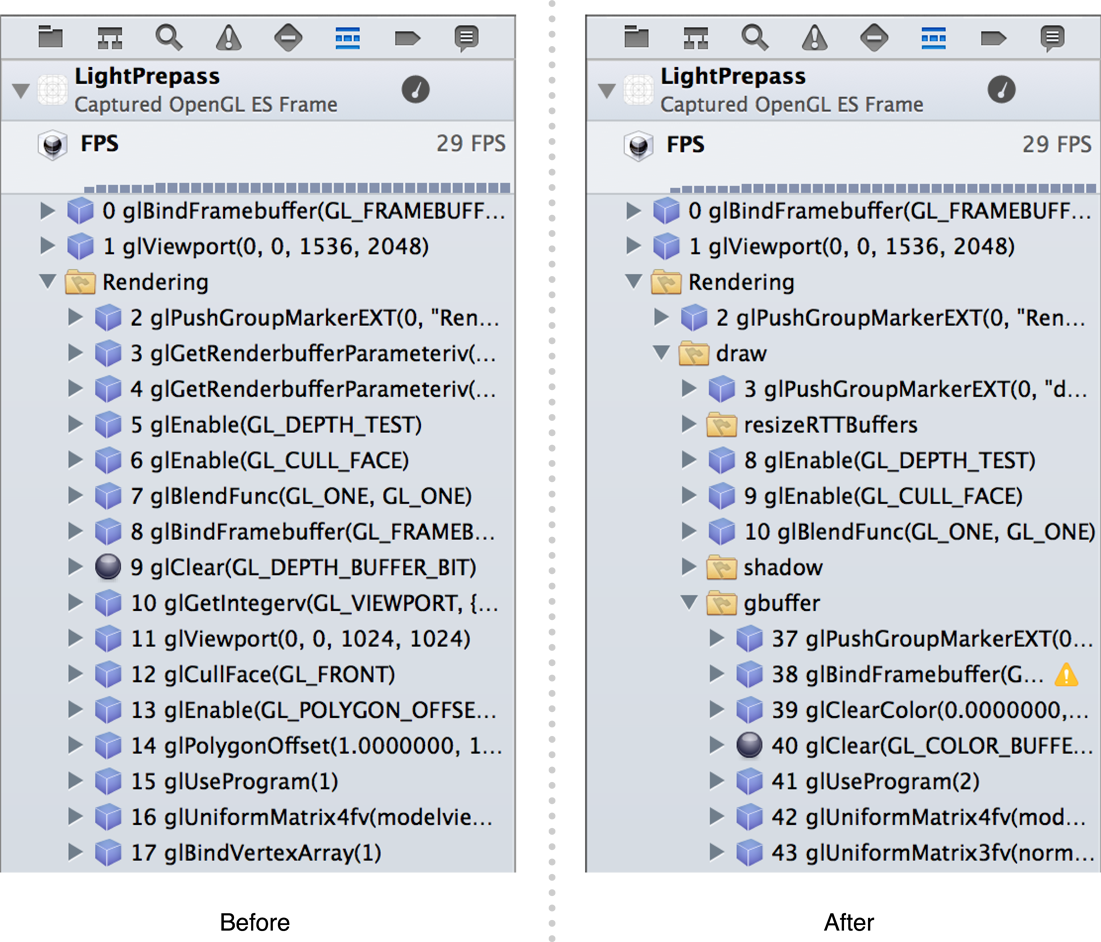 Figure 7-1  Xcode Frame Debugger before and after adding debug marker groups