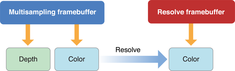 Figure 4-4 shows how multisampling works. Instead of creating one framebuffer object, your app creates two. The multisampling buffer contains all attachments necessary to render your content (typically color and depth buffers). The resolve buffer contains only the attachments necessary to display a rendered image to the user (typically a color renderbuffer, but possibly a texture), created using the appropriate procedure from Creating a Framebuffer Object. The multisample renderbuffers are allocated using the same dimensions as the resolve framebuffer, but each includes an additional parameter that specifies the number of samples to store for each pixel. Your app performs all of its rendering to the multisampling buffer and then generates the final antialiased image by resolving those samples into the resolve buffer.