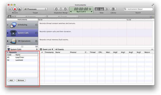 To find your signposts in the event list, you must first make Instruments aware of your custom signpost definitions. Do so by filling in the Signposts table in the System Calls instrument. Add one signpost definition per line. Each line should contain an event code followed by an event name, as illustrated in Figure 2-2.