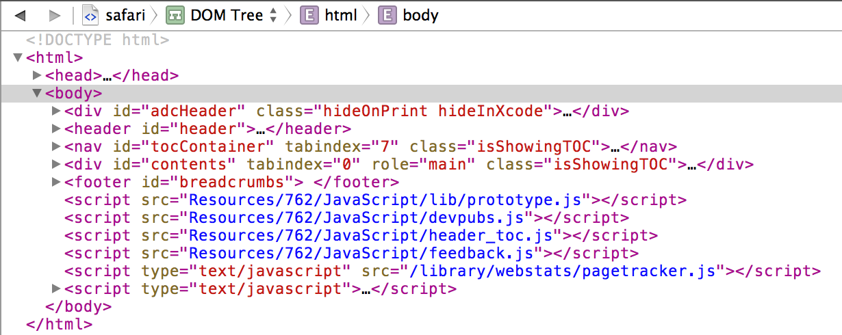 Any scripts that have loaded from an installed Safari extension appear in a group labeled Extension Scripts. For more information about Safari Extensions, read Safari Extensions Development Guide.