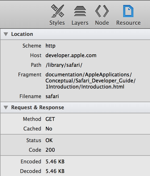 The Resource sidebar shows information about the selected resource. You can view the full URL of the resource, as well as the server request and response headers that were sent with this resource, as shown in Figure 2-9.