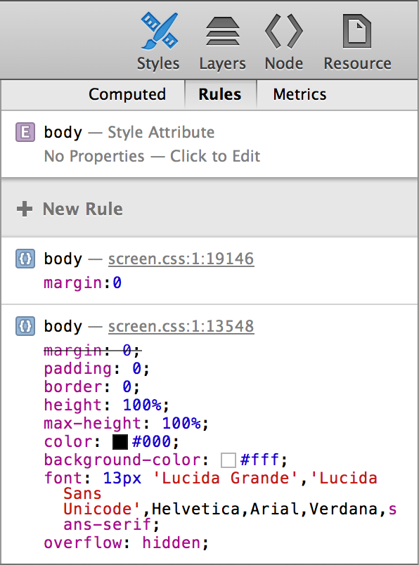 While it’s quicker to change an element’s CSS rules in the Figure 2-11 sidebar, you can also live-edit the stylesheet directly in the content browser. Select a CSS resource and begin typing, just as you would in a text editor.
