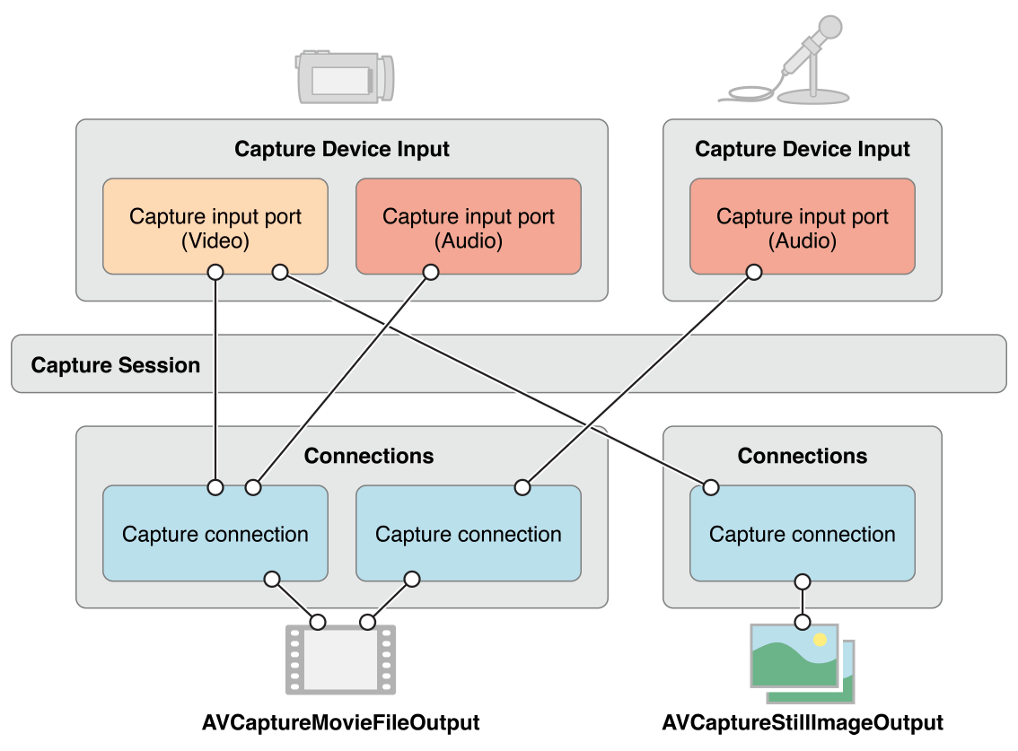 When you add an input or an output to a session, the session forms connections between all the compatible capture inputs’ ports and capture outputs, as shown in Figure 4-2. A connection between a capture input and a capture output is represented by an AVCaptureConnection object.