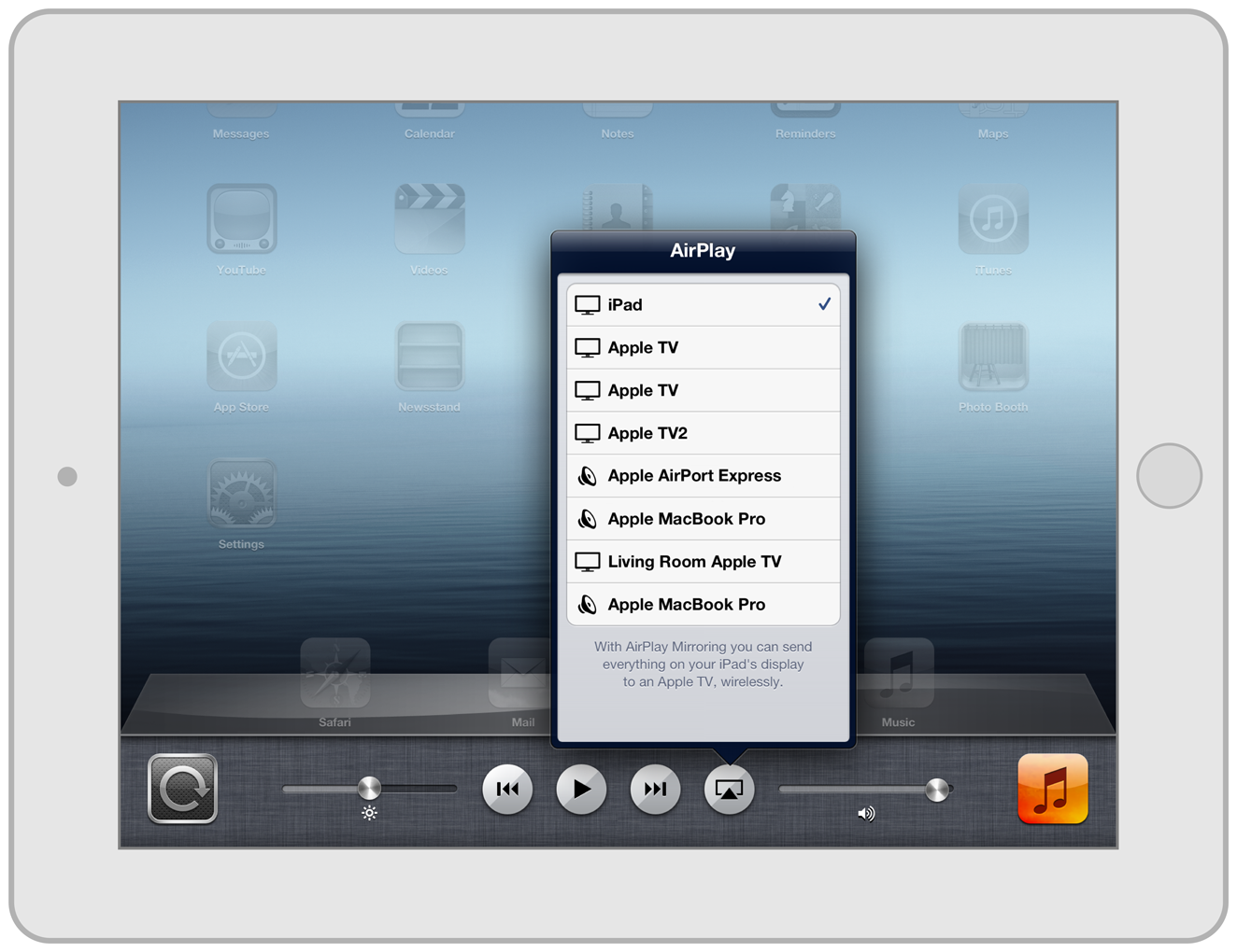 The user can go to the system AirPlay picker in the iOS multitasking interface to select an AirPlay output, as illustrated in Figure 3-1. If an AirPlay output device is available, an AirPlay button appears next to the volume slider; tapping the button displays a list of available devices.