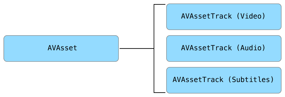 AVAsset is a container object composed of one or more instances of AVAssetTrack, which models the asset’s uniformly typed media streams. The most commonly used track types are audio and video tracks, but AVAssetTrack also models other supplementary tracks such as closed captions, subtitles, and timed metadata (see Figure 3-1).