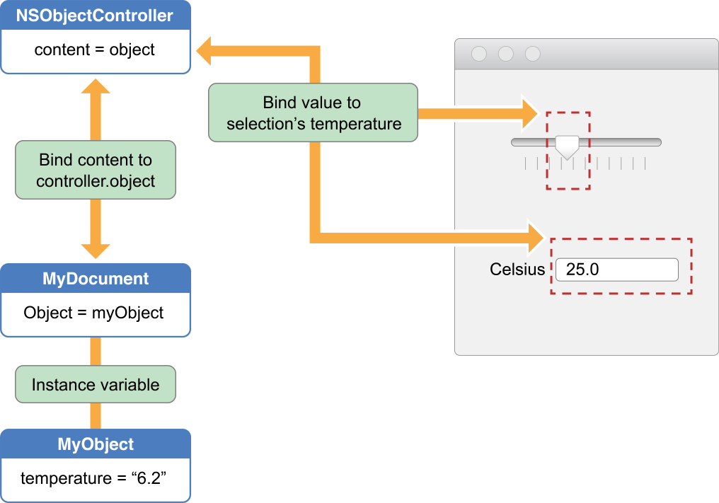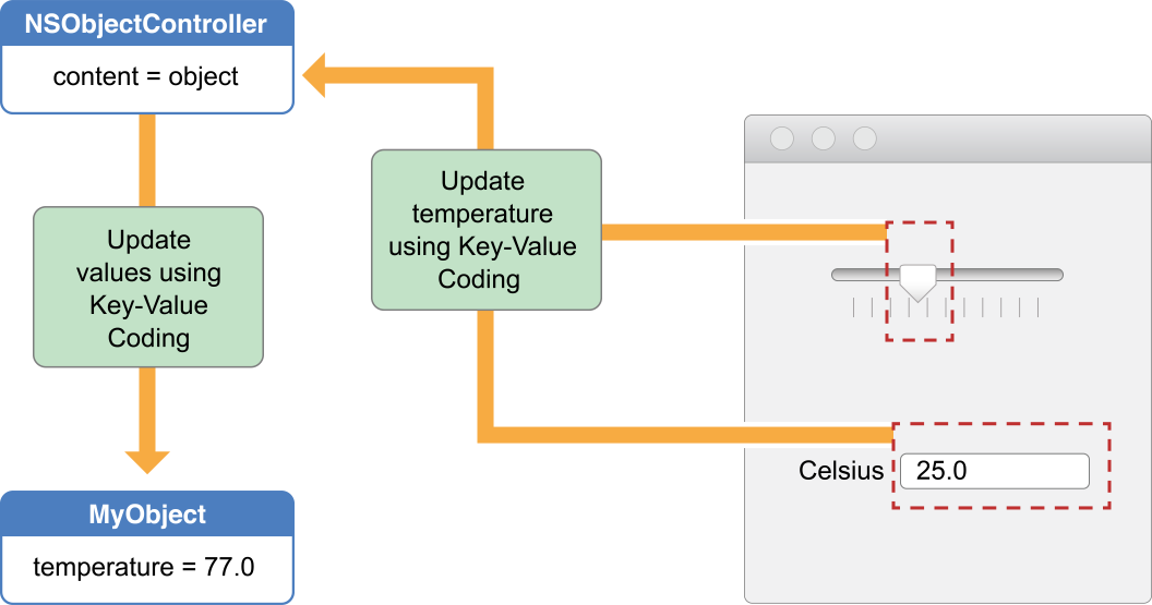 Key-value observing is a mechanism whereby an object can register with another to be notified of changes to the value of a property. When one object is bound to another object, it registers itself as an observer of the relevant property of that object. In the current example, the text field and slider register as observers of the temperature property of the controller’s content, as illustrated in Figure 9.