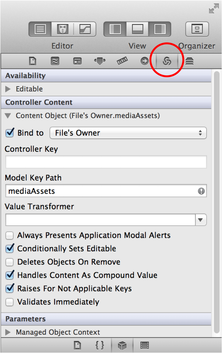 Next you need to connect your views to your models via a controller. NSArrayController is specifically designed to manage selectable collections of objects. For this reason, it is ideal for implementing a master-detail interface. After you create an array controller, you specify its content to be your collection of model objects. If the array controller is editable, it can also create instances of models and add them to the collection. For this to work, you also need to tell the array controller the class name the entity it is managing.