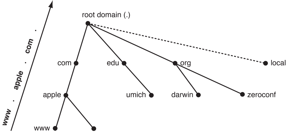 At the top of the inverted tree is the root domain. Below it are some of the top-level domains: com., edu., and org., and the local Bonjour “domain” local., discussed further in Bonjour and the Local Link. Below the top level are a few second-level domains, apple, darwin, and zeroconf. The tree can extend infinitely downward with, for example, www, at the third level.