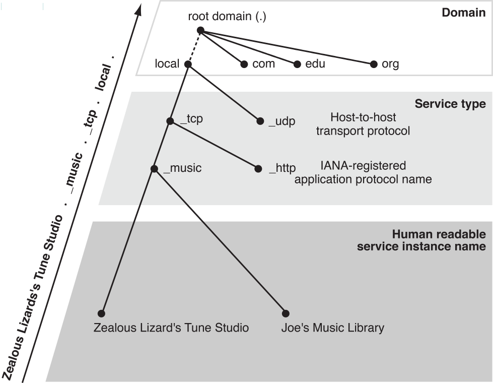 Figure 2-2 illustrates the organization of the name of a Bonjour service instance. At the top level of the tree is the domain, such as local. for the local network. Below the domain is the registration type, which consists of the service type preceded by an underscore (_music) and the transport protocol, also preceded by an underscore (_tcp). At the bottom of the tree is the human-readable service instance name, such as Zealous Lizard’s Tune Studio. The complete name is a path along the tree from bottom to top, with each component separated by a dot.