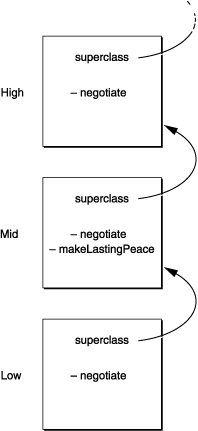 The difference between self and super becomes clear when using a hierarchy of three classes. Suppose, for example, that we create an object belonging to a class called Low. The superclass of Low is Mid; the superclass of Mid is High. All three classes define a method called negotiate, which each class uses for its own purpose. In addition, Mid defines an ambitious method called makeLastingPeace, which itself employs the negotiate method. The classes and those methods are illustrated in Figure 2-2.