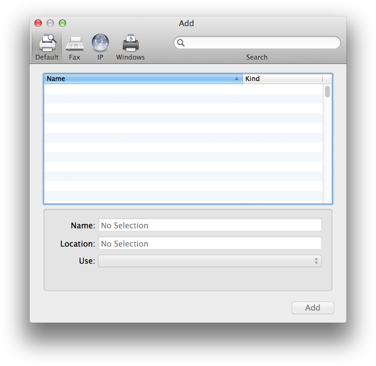 Choosing a printer for printing is easy for the user, which they do through the Printer pop-up menu in the Print panel. The user can choose from a list of nearby printers and OS X sets up the printer automatically. A user who needs more control on adding printing devices can choose Add Printer to access the Add window as shown in Figure 1-4. This window is automatically populated by the devices that OS X can detect, including AirPrint printers. Users have the option to add specific host name or IP addresses as well as to add Fax and Windows workgroup printers.