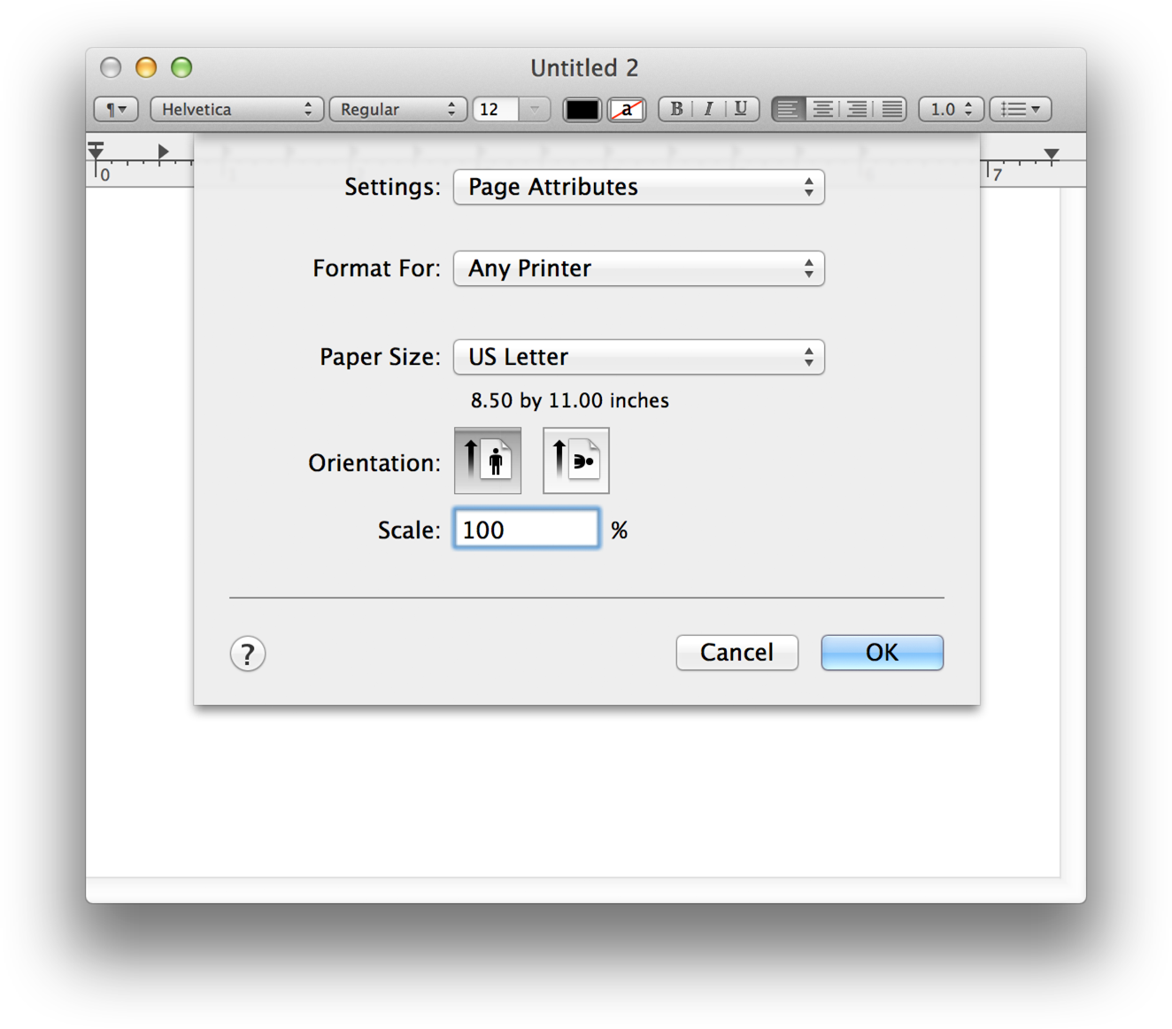Some apps also provide users with the option to setup the page through the Page Setup pane as shown in Figure 1-5. Most of the time users shouldn’t need to perform any setup through this panel. So if your app doesn’t need it, make the user experience simpler by not providing a Page Setup command.