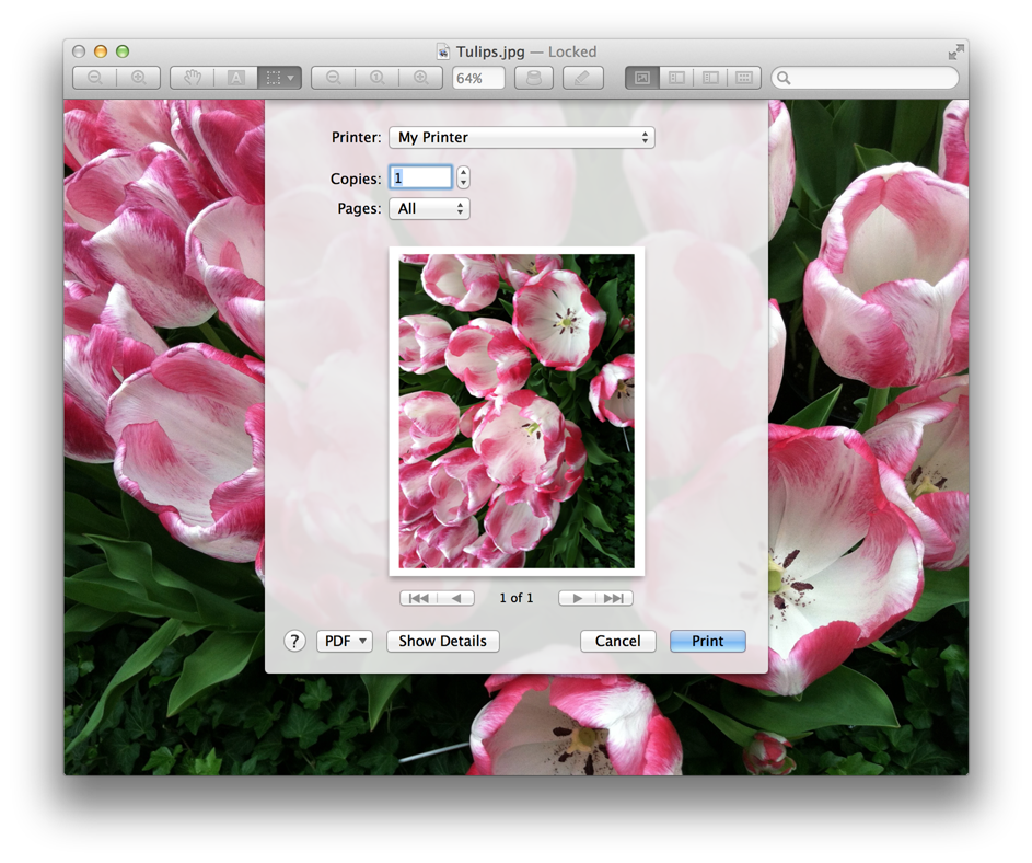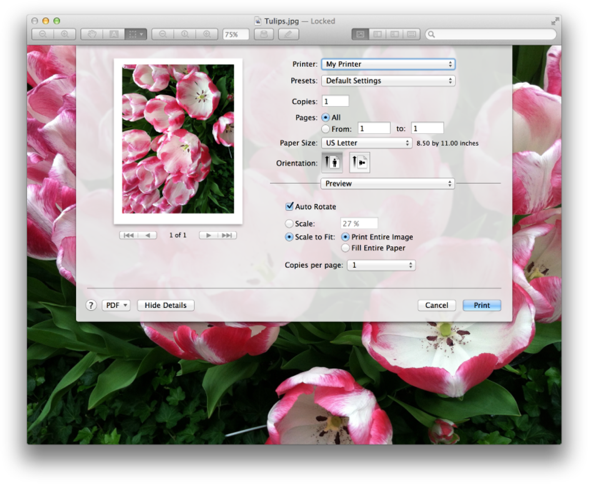 The user can click the Show Details button to control a variety of printing options including layout, color matching, and paper handling. Many options are dependent on the features available for the specified printer, such as the availability of duplex printing. An app can supply its own options, as shown in Figure 1-3. In this example, Preview supports rotation, scaling, copies per page, and how to fill the page with the image.