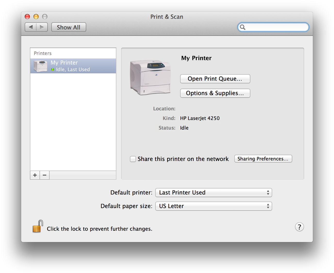 Users can manage printers through the Print & Scan preference pane in System Preferences, as shown in Figure 1-6.