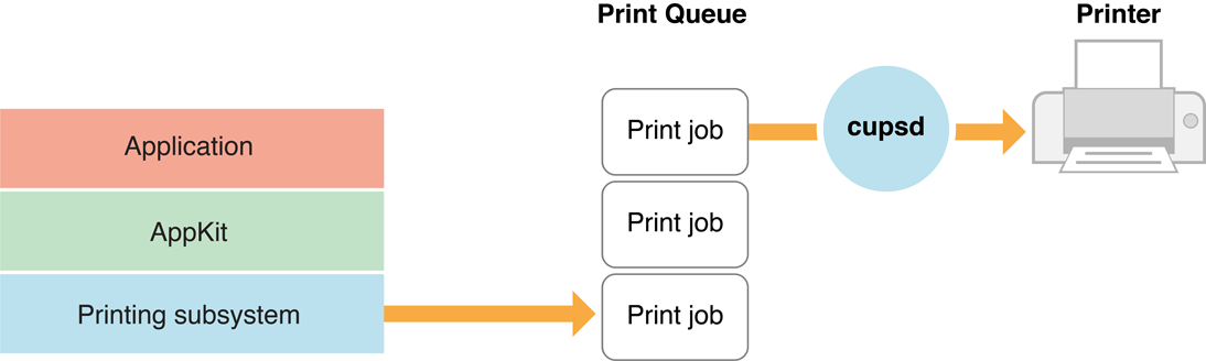 When a print job rises to the top of the queue, the system printing daemon (cupsd) considers the destination printer’s requirements and, if necessary, converts the print data to a form that is usable by the printer. The printing subsystem reports error conditions such as “Out of Paper” to the user as alerts. It also reports the progress of print jobs programmatically to the PrintProxy app, which displays information such as “page 2 of 5” for a print job. (The PrintProxy app takes on the name of the printer. It’s the app the displays the queued print jobs for that printer and allows the user to pause, resume, and cancel jobs that are in the queue.)