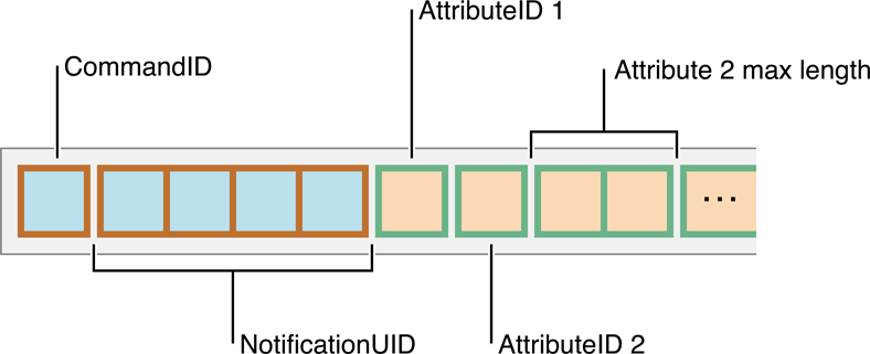 The Get Notification Attributes command allows an NC to retrieve the attributes of a specific iOS notification. The format of a Get Notification Attribute command is shown in Figure 2-3.
