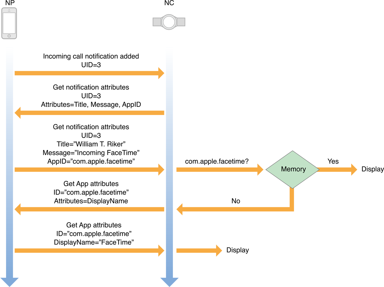 It is strongly recommended for an NC to fetch attributes only as needed and possibly in response to user actions. For example, if an NC chooses to display active iOS notifications in a simple list, and to show only details about a specific iOS notification when selected by the user, then the retrieval of this iOS notification’s attributes can be triggered lazily.