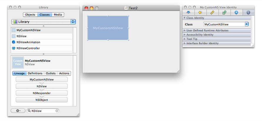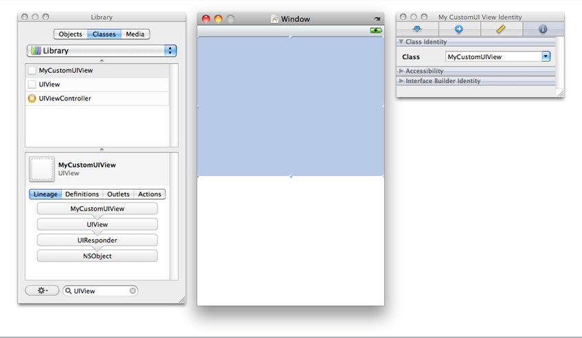 Although the standard system views and controls provide a variety of choices for building an interface, there are many times when you may want to provide customized behavior for your application. If your nib document is associated with a Cocoa Touch project, Interface Builder is aware of any custom views declared in your source code. You can find your custom views listed in the Classes tab of the Library window. Dragging a custom view object to a window (or to the top level of your nib document) creates an unadorned rectangular area representing the space occupied by the object. Interface Builder sets the object’s class name in the identity inspector, as illustrated in Figure 4-1. To learn about setting the class identity of a generic view object, see Setting the Class of an Object.
