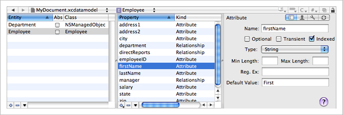The table in the entities pane (the leftmost pane) lists all the entities in the model, either as a flat list or in an inheritance hierarchy. The table has three columns, showing the entity name, the class used to represent the entity, and a checkbox that indicates whether the entity is abstract. You can edit the entity and class names directly in the text field cells—double click the text to make it editable—and toggle the abstract setting of an entity by clicking the checkbox. For more about entities, see NSEntityDescription.