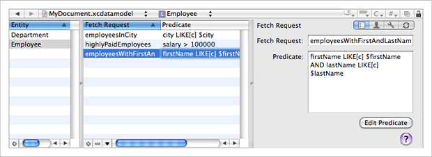 For fetch requests, you specify the name and the predicate. As with fetched properties, to edit the predicate using the predicate builder, click the Edit Predicate button—see Fetched Properties and Fetch Request Templates.