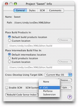 Choose your version control system from the SCM System pop-up menu in the General pane in the Project Info window, shown in Figure 21-1.