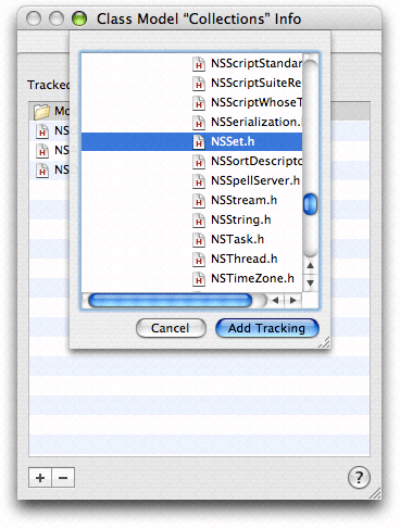 To change the list of tracked items that belong to the model you can use the Tracking pane of the Info window (inspector) as shown in Figure 11-2. Click the plus sign or minus sign (in the lower left of the pane) to add or remove files and groups respectively.