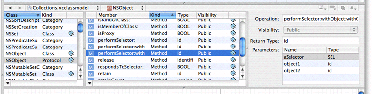 The Xcode class modeling tool helps you to explore and understand the classes in your project, whether they’re written in Objective-C, C++, Java, or a mixture of those languages. It allows you to see class relationships (subclass and superclass relationships—including support for multiple inheritance in C++), protocols (or Interfaces in Java), and categories. In the diagram view, color and text coding help you to quickly distinguish between classes, categories, and protocols; and between project and framework code. The visibility (public, private, protected) of member functions and variables is shown appropriately. (If you are not familiar with any of these terms, you should consult suitable programming texts.)