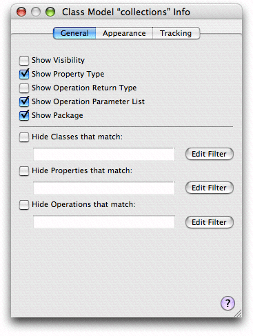 Filters apply as changes are made to files that contribute to the model. If you chose, for example, to hide all classes whose names begin with “XYZ”, then in your header file you rename the class “XYZWidget” to “WXYWidget”, a node for “WXYWidget” will appear in your diagram. To set up filtering, you use the General pane of the Info window, shown in Figure 11-4.