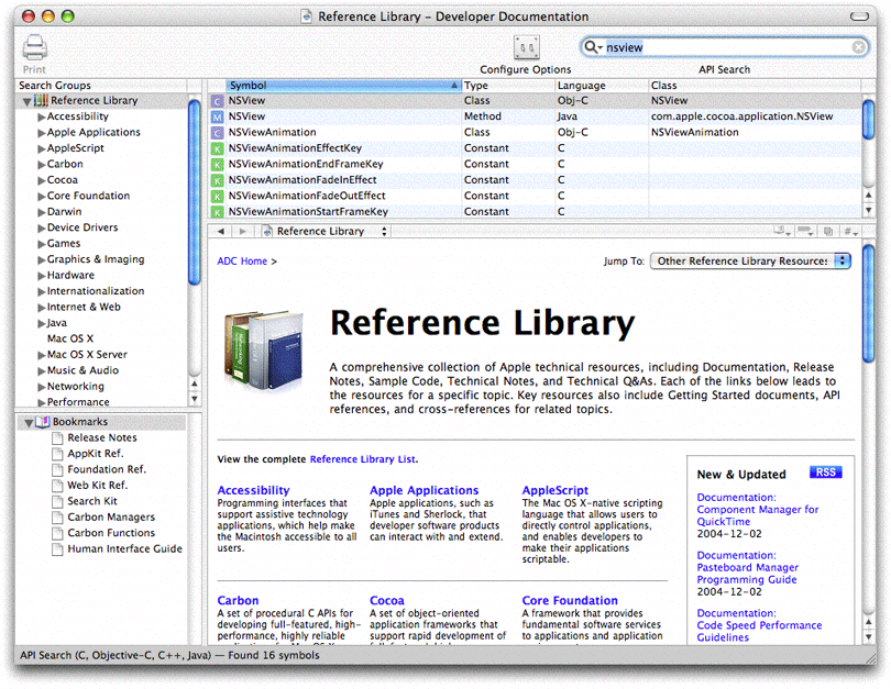 The current selection in the Search Group list determines the programming languages for which Xcode returns results. For example, if you select “Reference Library,” Xcode returns all matching symbols, regardless of the type or language. If you select Carbon in the Search Groups list and perform an API lookup, Xcode returns only matching C and C++ symbols.