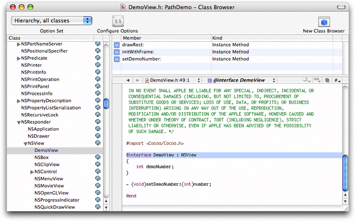 Class browser. Using the class browser, you can view the classes in your project and its included frameworks. From the class browser, you can easily access declarations, source code, and documentation for these classes and their members. The class browser is discussed in the section Viewing Your Class Hierarchy.