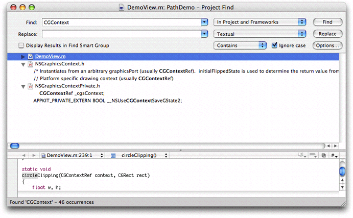 This section describes how to use Xcode’s project-wide search features to search through multiple files in your project and its included frameworks for text, regular expressions, and symbol definitions. This section also describes how to view search results. The single-file find is discussed further in Searching in a Single File. In addition, shortcuts for performing searches from an Xcode editor window are described in Shortcuts for Finding Text and Symbol Definitions From an Editor Window.