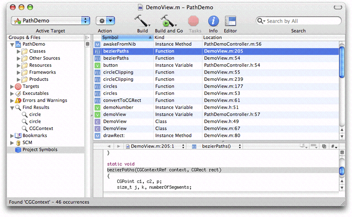 Xcode also maintains a great deal of information about your project’s contents, which it uses to assist you in the development process. The Xcode feature called Code Sense maintains an index that contains symbolic information for your project; Xcode uses this information as the basis for a number of features that let you browse the symbols in your project, view the class hierarchy of projects that use an object-oriented programming language, and search your project for symbol definitions.