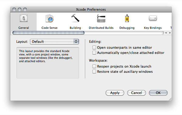 The General pane of Xcode preferences lets you control general environment settings for the Xcode application, such as your project window configuration and windowing preferences. Figure 2-2 shows the General pane.