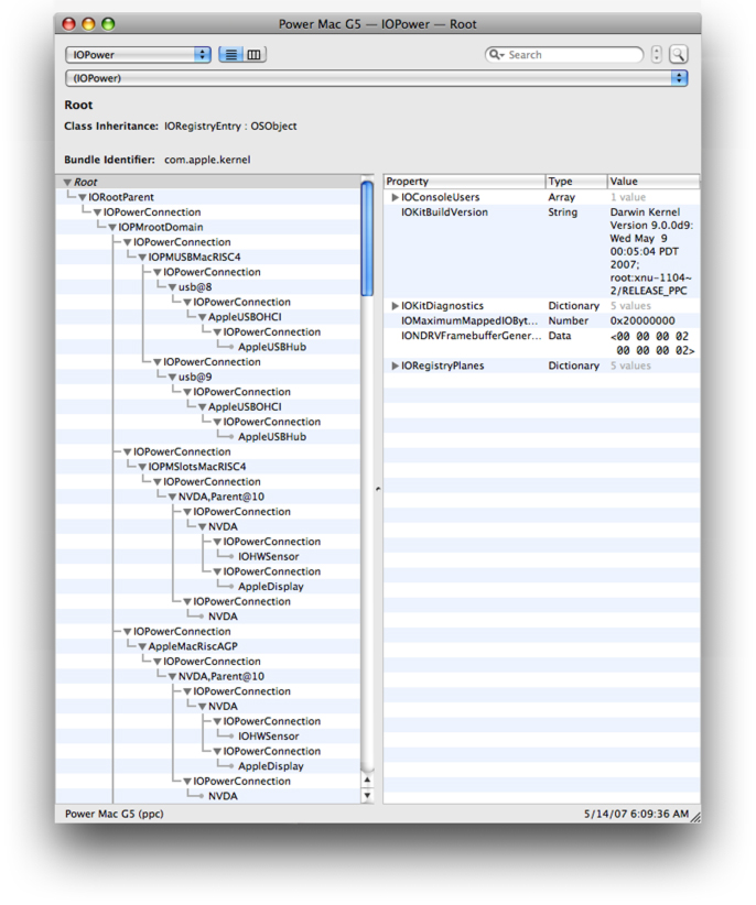 The power plane is one of the planes of the I/O Registry. As described in The I/O Registry the I/O Registry is a dynamic database of device and driver objects that expresses the various provider-client relationships among them. To view the power plane in a running system, open the I/O Registry Explorer application (located in /Developer/Applications/Utilities) and choose IOPower from the pop-up menu. You can also enter ioreg -p IOPower at the command line to see a representation of the current power plane. Figure 9-1 shows the power plane in a Power Mac G5 running OS X v10.5.