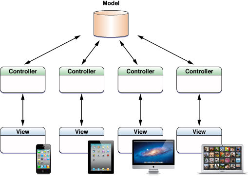 By separating these concerns, you can revise one portion of your app without requiring significant changes in the rest of the app. This concept is important if you intend to redesign your user interface; ideally, you should be able to replace the user interface of your app without changing the model code. Being able to replace the user interface not only makes it easy to adjust the design of your user interface based on user feedback, it also makes it easy to extend your app to provide new user interfaces or share model classes between multiple apps. Figure 4-4 shows a single common data model applied across iOS and Mac apps.