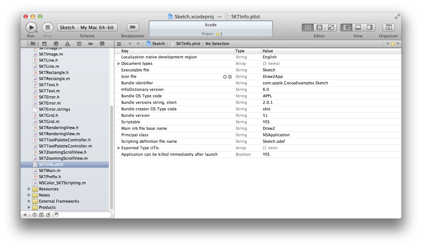 To view the contents of your Info.plist file, select it in the Groups & Files pane. Xcode displays a property list editor similar to the one in Figure 5-1 (which is from Xcode 3.2.5). You can use this window to edit the property values and add new key-value pairs. By default, Xcode displays a more user-friendly version of each key name. To see the key names that Xcode adds to the Info.plist file, Control-click an item in the editor and choose Show Raw Keys/Values from the contextual menu that appears.