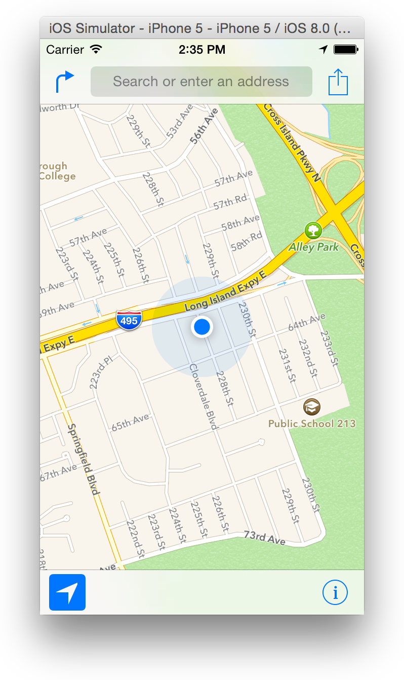 After completing this task, notice that the blue dot representing your location is in New York, NY, near the Long Island Expressway, as shown in Figure 1-7.