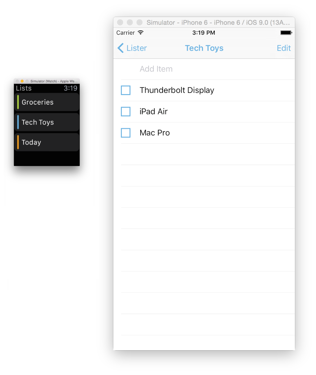 Running the WatchKit target launches two simulators, one for the iOS device and one for the watchOS device. Figure 1-2 shows an iPhone 6 and a 42mm watch running in two different simulators.