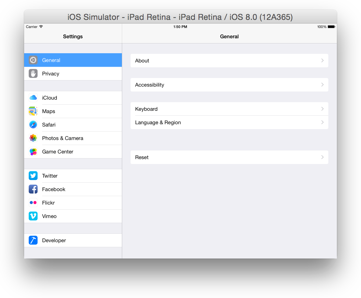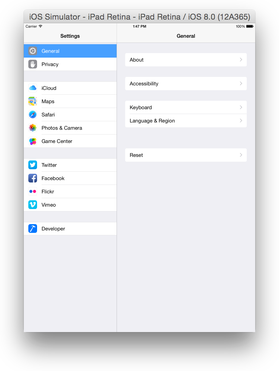 On a simulated device, use the Settings app. To open the Settings app, go to the Home screen and click or on tvOS, choose Settings. In Figure 1-8 you see the Settings app as it appears when launched in the iOS simulation environment.