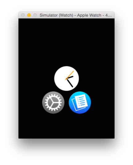 The Home screen for a simulated watchOS device behaves the same as it would on an actual device. You can click and drag to simulate the finger dragging around the screen and launch an app by clicking on it. Figure 1-4 shows the home screen of a 42mm watch with a developer app, the Lister sample code.