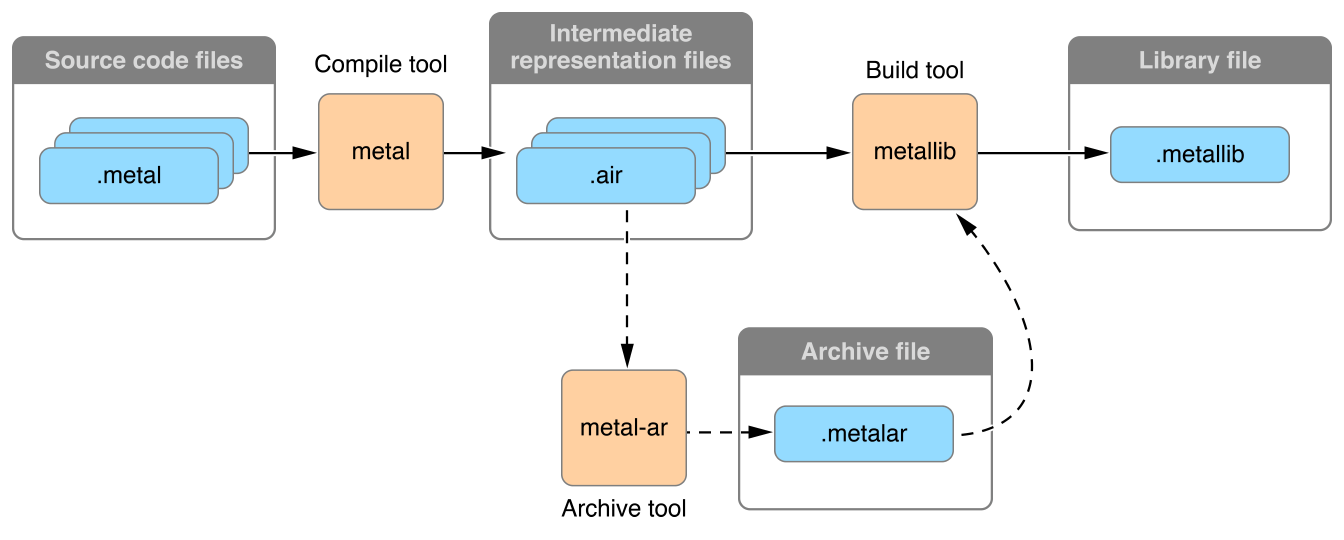 Figure 8-1 shows the command line utilities that form the compiler toolchain for Metal shader source code. When you include .metal files in your project, Xcode invokes these tools to build a library file that you can access in your app at run time.
