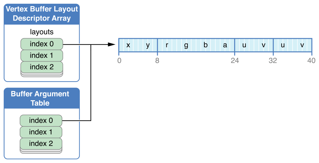 vertexDescriptorproperty to describe the organization of the vertex data in that argument, as described in Vertex Descriptor for Data Organization.The default value of