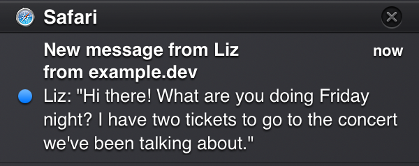 body—The notification’s subtitle.tag—The notification’s unique identifier. This tag prevents duplicate entries from appearing in Notification Center if the user has multiple instances of your website open.