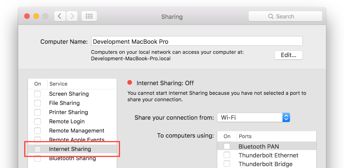 Choose the network interface that provides your Internet connection, such as Thunderbolt Ethernet.